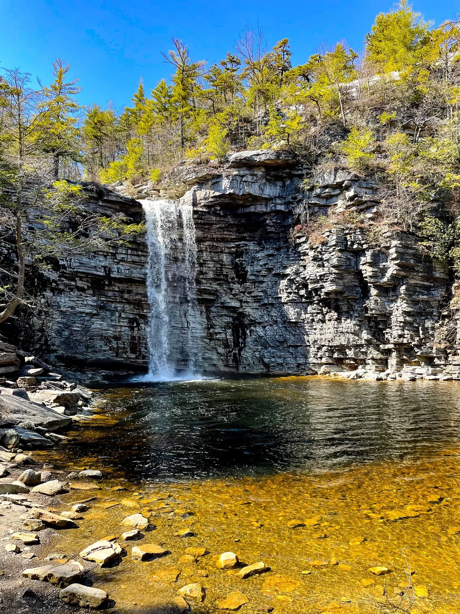Minnewaska State Park (20 minutes) – Crystal-clear mountain lakes perfect for swimming in summer, dramatic waterfalls including the 60-foot Awosting Falls, and miles of trails through dwarf pine forests. The dramatic cliff-edge carriage roads offer accessible hiking with spectacular views. In winter, the trails are popular for snowshoeing and cross-country skiing. The waterfall below is where the Severance retreat is filmed (pro tip).